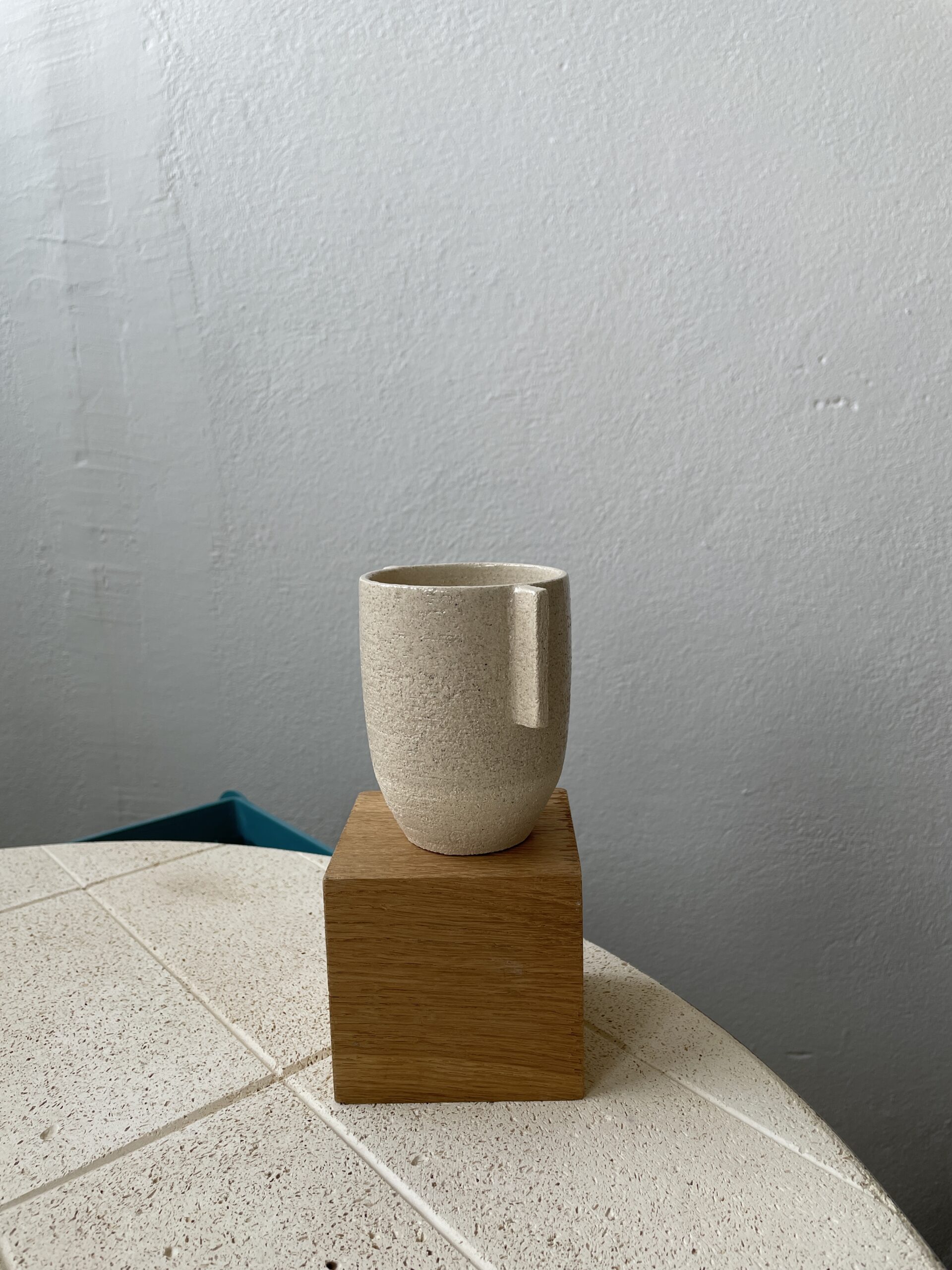 Tasse réalisée en grès chamotté tournée puis façonnée à la main. Sa texture minérale légèrement brute met en valeur le grain de la terre, tandis que son anse sculpturale et architecturée lui apporte une touche graphique originale.